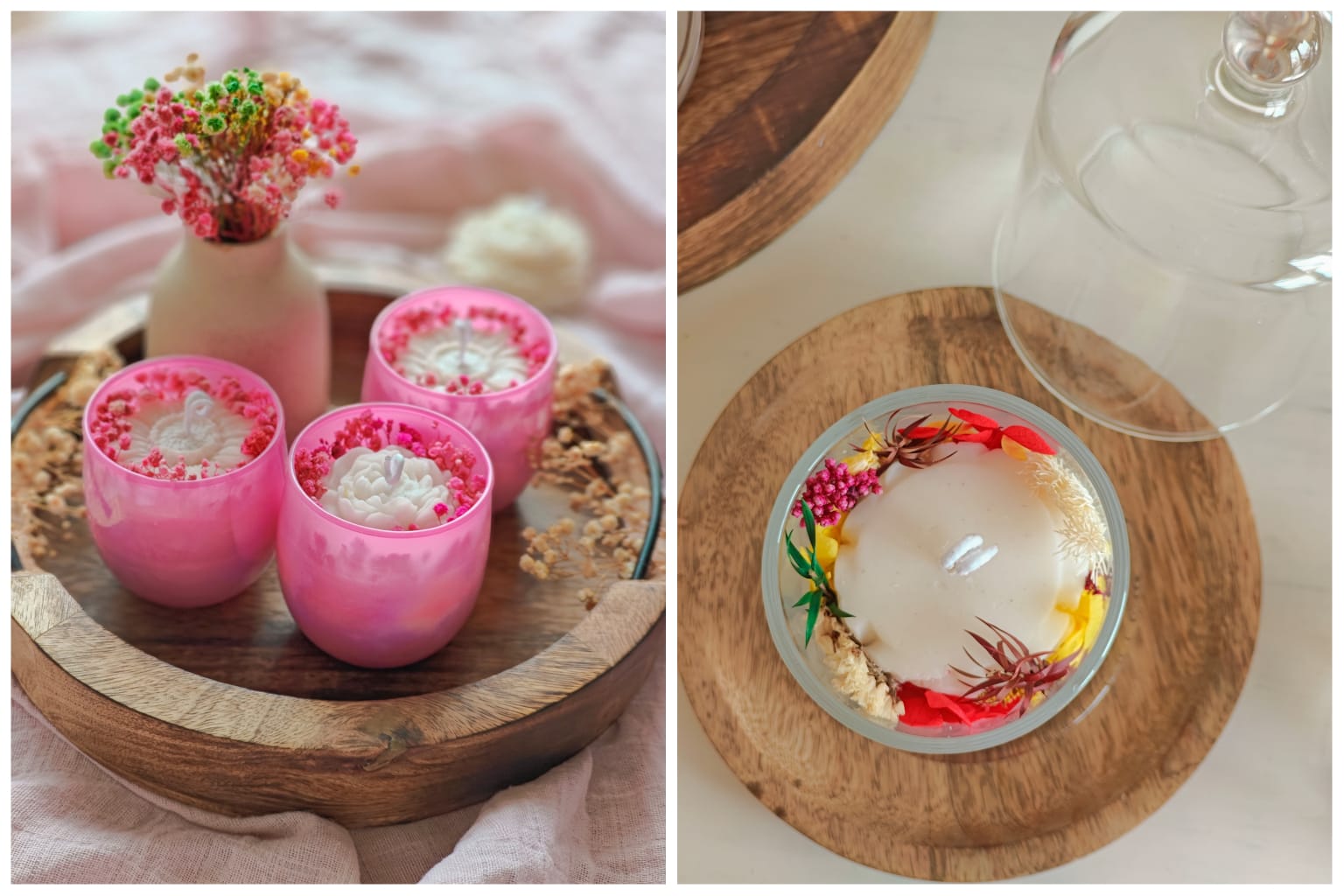 Illuminate your space with our hand-poured soy and beeswax candles, infused with natural dried flowers for a touch of organic beauty. Crafted to blend sustainability with style, each piece offers more than just a warm glow. Repurpose our earthy ceramic jars as décor, embrace tradition with regal brass urlis, or add rustic charm with wooden bowls. For a modern touch, our glass bell jar candles bring vibrant elegance to any setting. Every candle reflects mindful craftsmanship, natural materials, and timeless design—made to light up your home and soul.