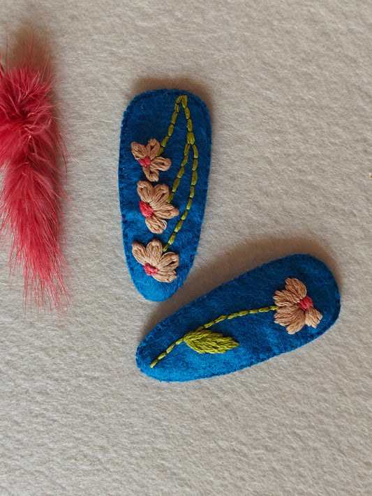 Blue Felt Hair Clip with Colourful Thread Embroidery