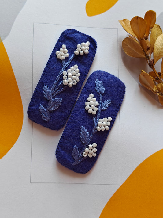 Dark Blue Felt Hair Clip with Thread and Bead Work