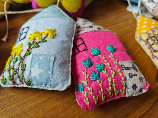 Hand-Embroidered Felt Hut Bunting | Whimsical Mini House Garland for Kids’ Rooms & Nurseries
