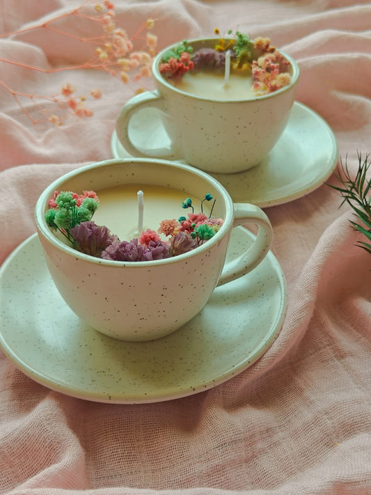 Handcrafted Hand poured Ceramic Cup & Saucer Soy Wax Candle with Natural Dried Flowers