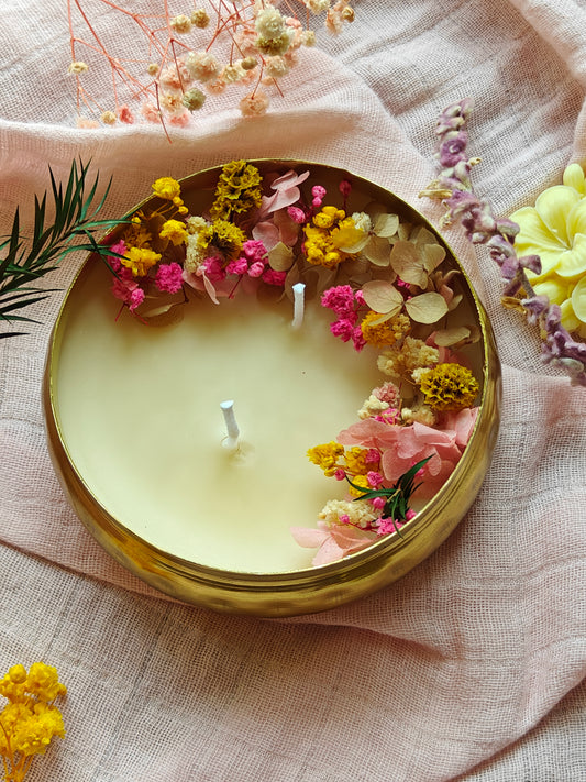 Handcrafted Hand Poured Brass Metal Urli Soy Wax Candle with Natural Dried Flower
