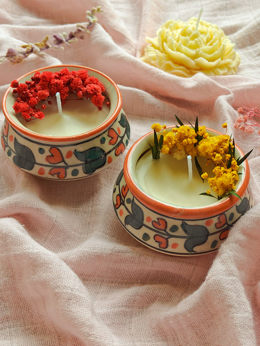 Handcrafted Handpoured Hand painted matka candles (set of 2)