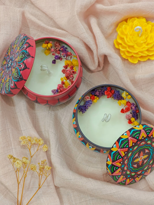 Handcrafted Handpoured Set of 2 Printed Tin Jar Soy Wax Candle with Natural Dried Flowers