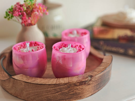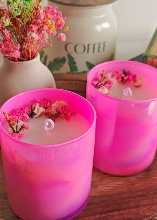Handcrafted Hand poured Pink Glass Votive Soy Wax Candle with Natural Dried Flowers