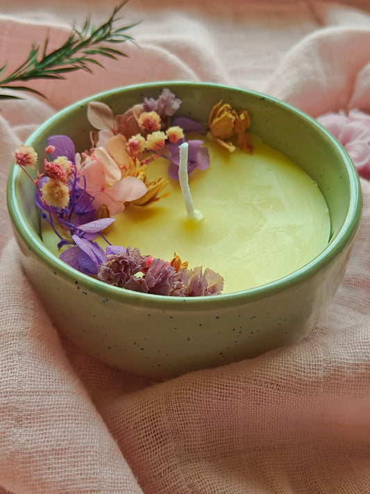 Handcrafted Olive Green Ceramic Bowl Soy Wax Natural Dried Flower Candle