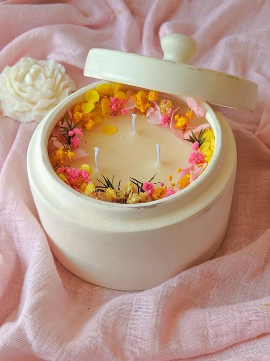 Handcrafted White Ceramic lid jar soy wax candle with natural dried flowers