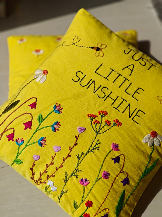 “Just a Little Sunshine” Bright Yellow Floral Hand-Embroidered Cotton Cushion Covers Set of 2
