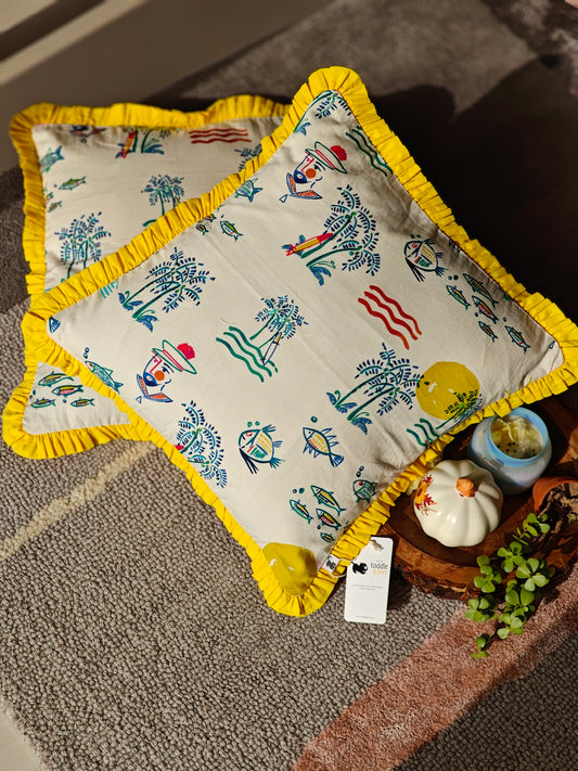 Playful Ocean Print Cushion Cover with Yellow Ruffle Border Set of 2