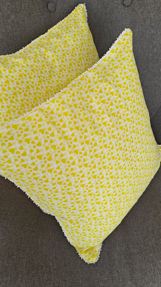 Cheerful Yellow Little Hearts Print Cushion Covers with Delicate Lace Edging Set of 2
