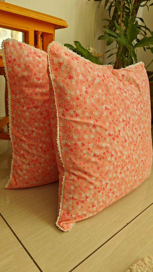 Soft Peach Cushion Cover Featuring Delicate Floral Pattern & Lace Edging Set of 2