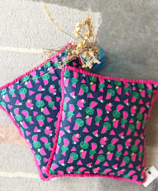 Tropical Watermelon & Monstera Pop Print Navy Cushion Cover with Pink Frills Set of 2