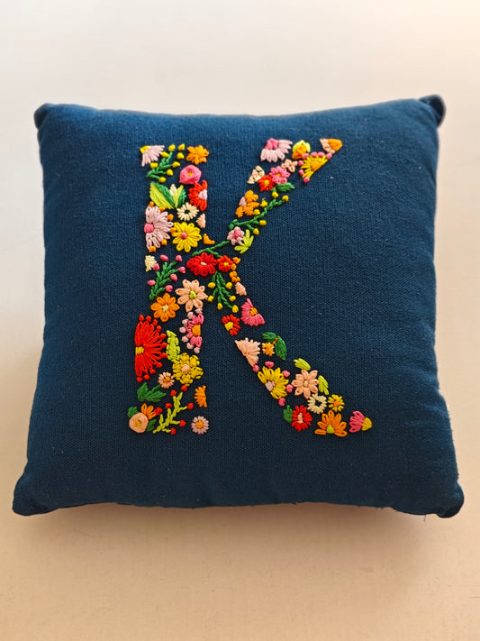 Hand Embroidered Customised Alphabet Cotton Cushion 10*10 Inches