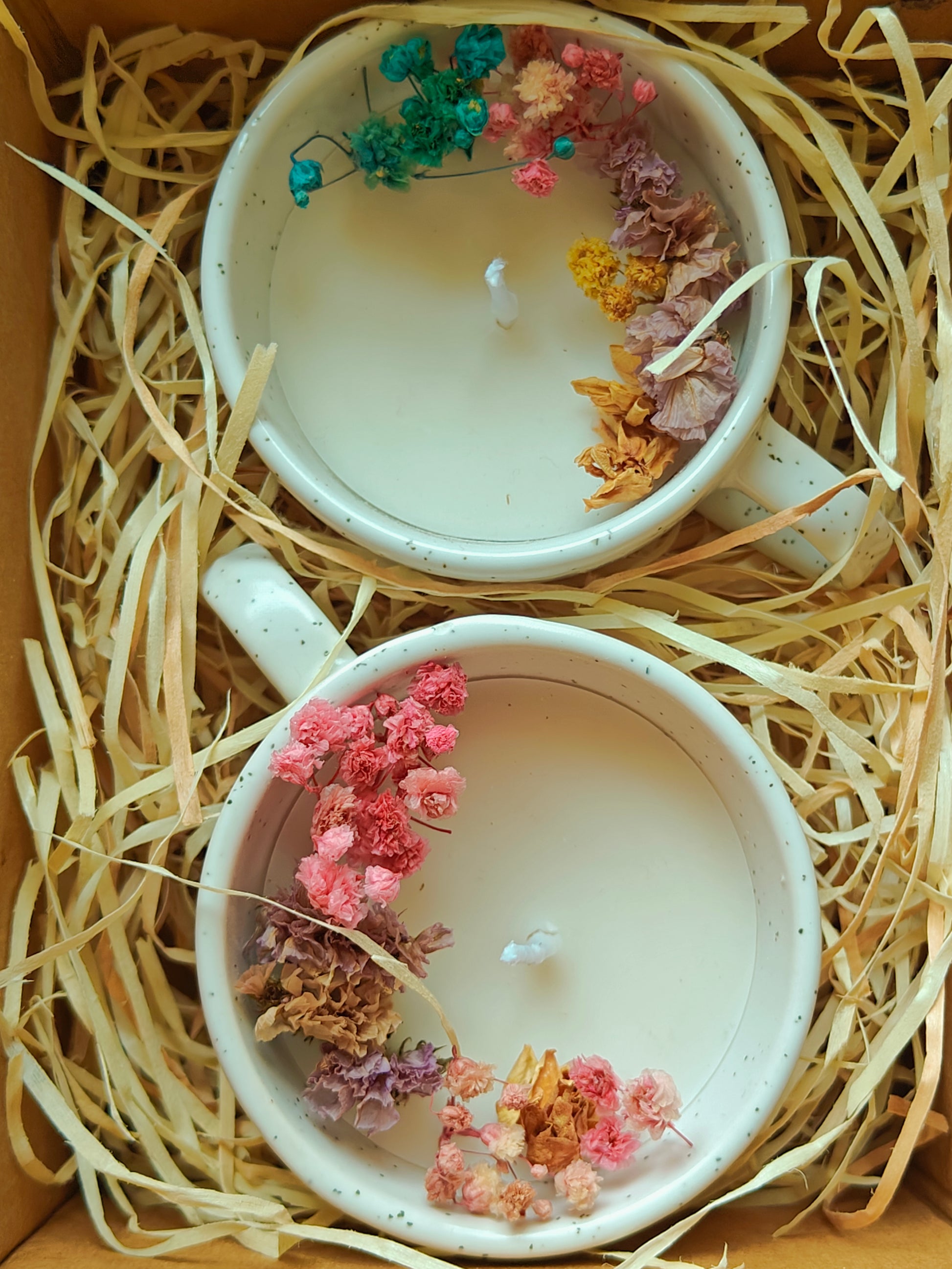 Product Detail: Set of 4, two cups & two saucers. Soy wax candle with natural dried flowers.